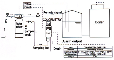 ColormetryCMU-124H Automatic monitoring system to detect the slightest water hardness leakage What is COLORMETRY (for Hardness) ? What hardness is considered to be the most common factor in damaging a boiler. The hardness level (ionic concentration) of water inflow to a boiler has been checked manually by using chemical reagents as an indicators. The manual measurement of these conventional methods comprises such problems as; time consumption; personal error or deviation; andlack of continuity in monitoring hardness leakage. COLORMETRY solves all these problems by offering an automatic monitoring system for sample water collection, chemical reagent injection, mixing and evaluation. |